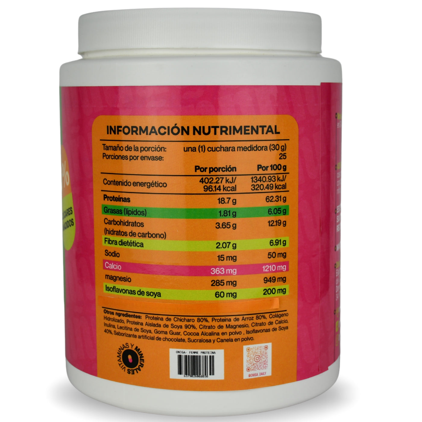 Ingredientes: Proteina de chicharo 80 % , Proteina de Arroz 80%, Colageno Hidrolizado, Proteina Aislada de Soya 90 %, Citrato de Magnesio, Citrato de Calcio, Inulina, Lecitina de soya, Goma guar, Cocoa alcalina en polvo, Isoflavonas de soya 40%, Saborizante artificial de chocolate, Sucralosa y Canela en polvo.
